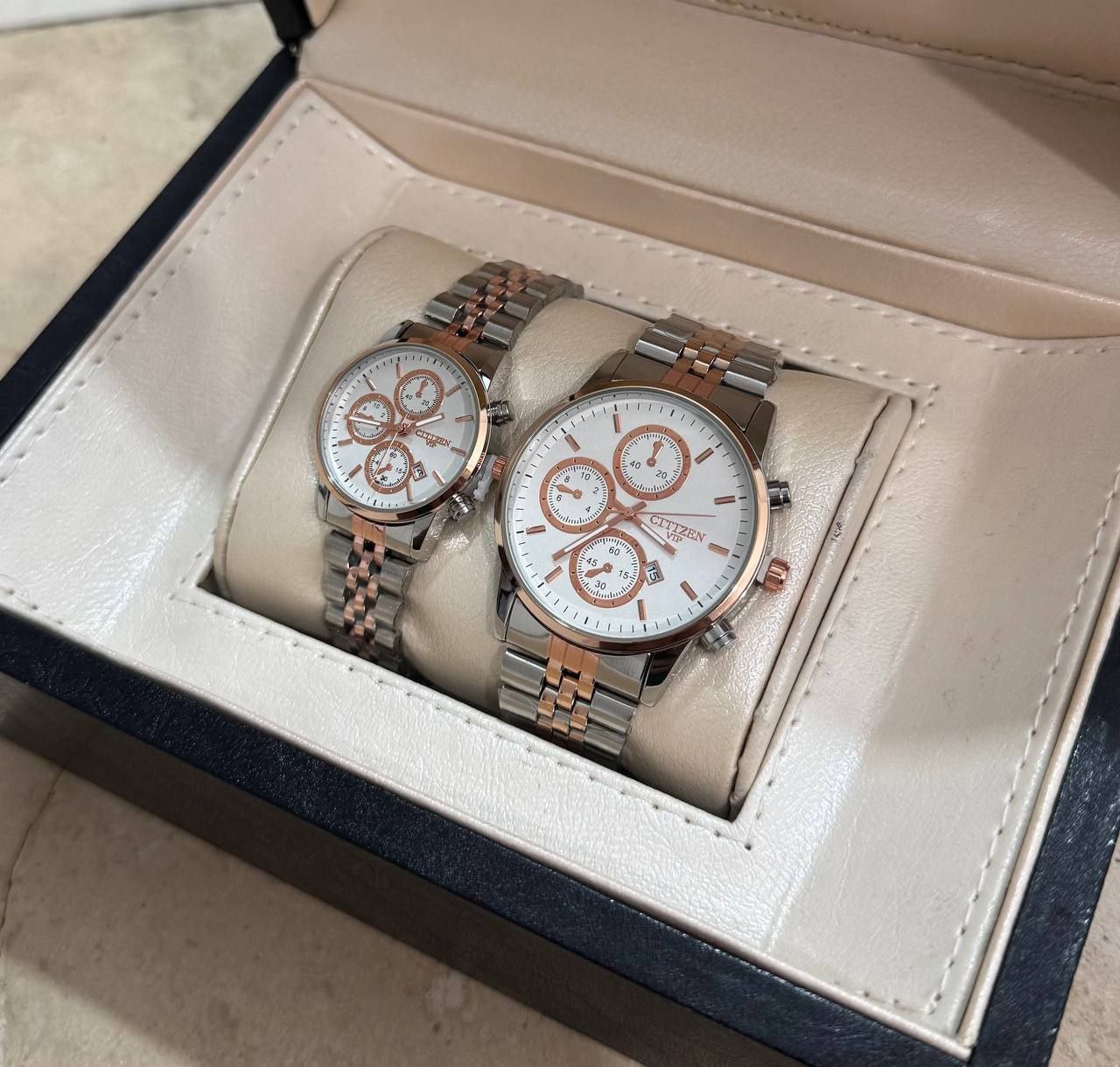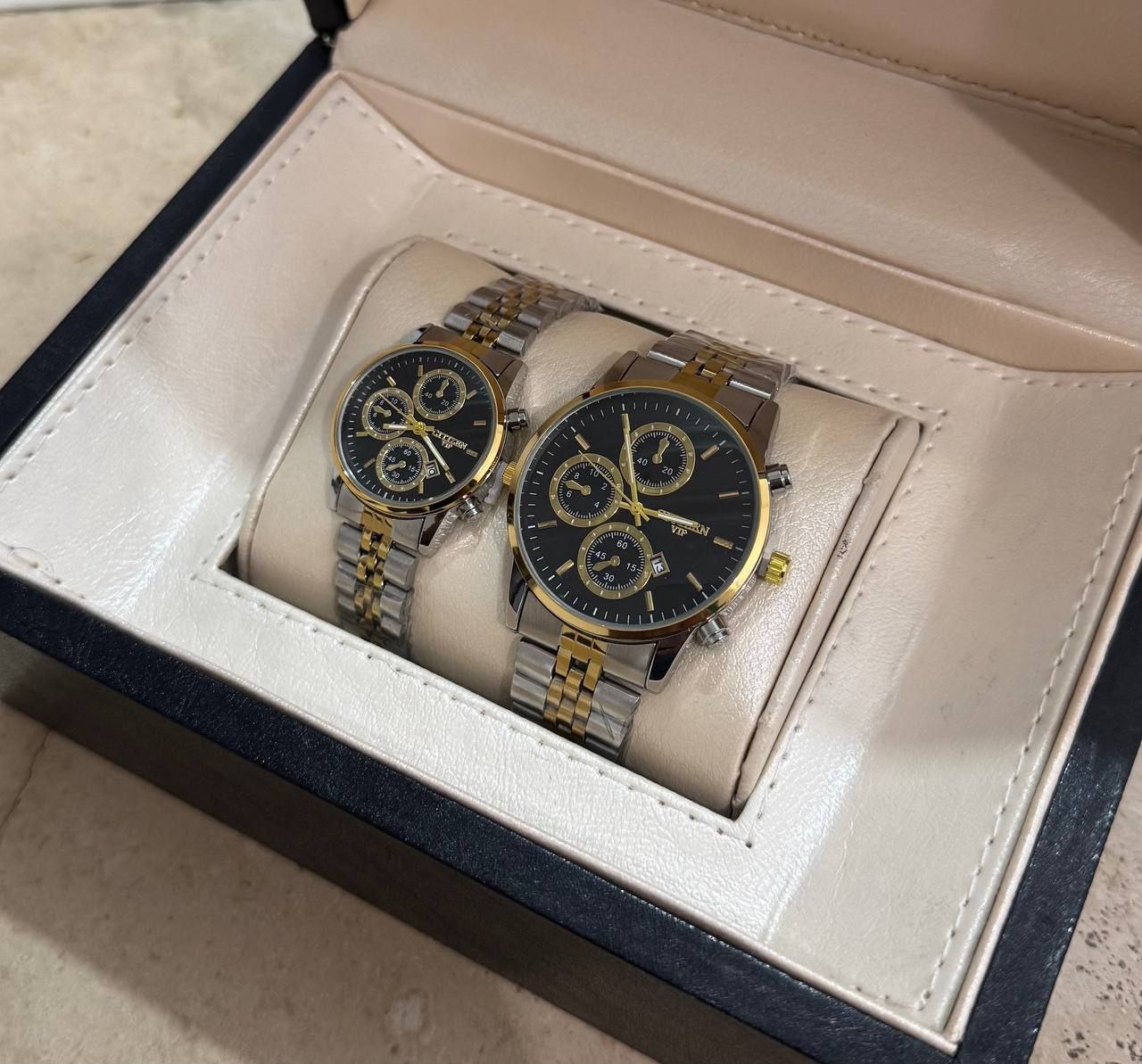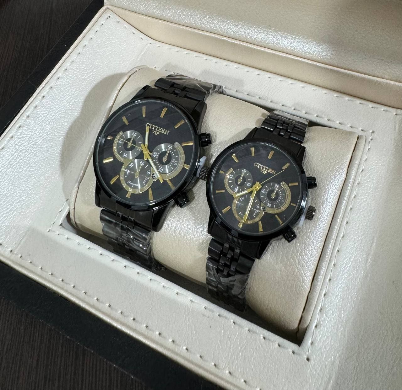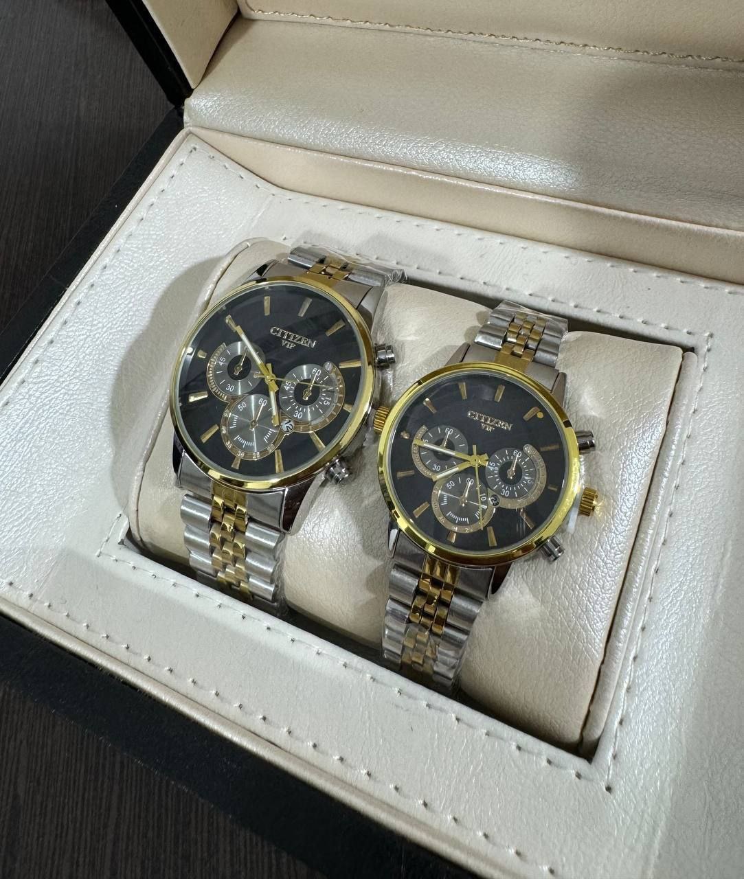 ساعت مچی مردانه و زنانه بند استیل سیتیزن VIP رنگبندی کامل - نقره ای طلایی صفحه مشکی / ست زنانه/مزدانه